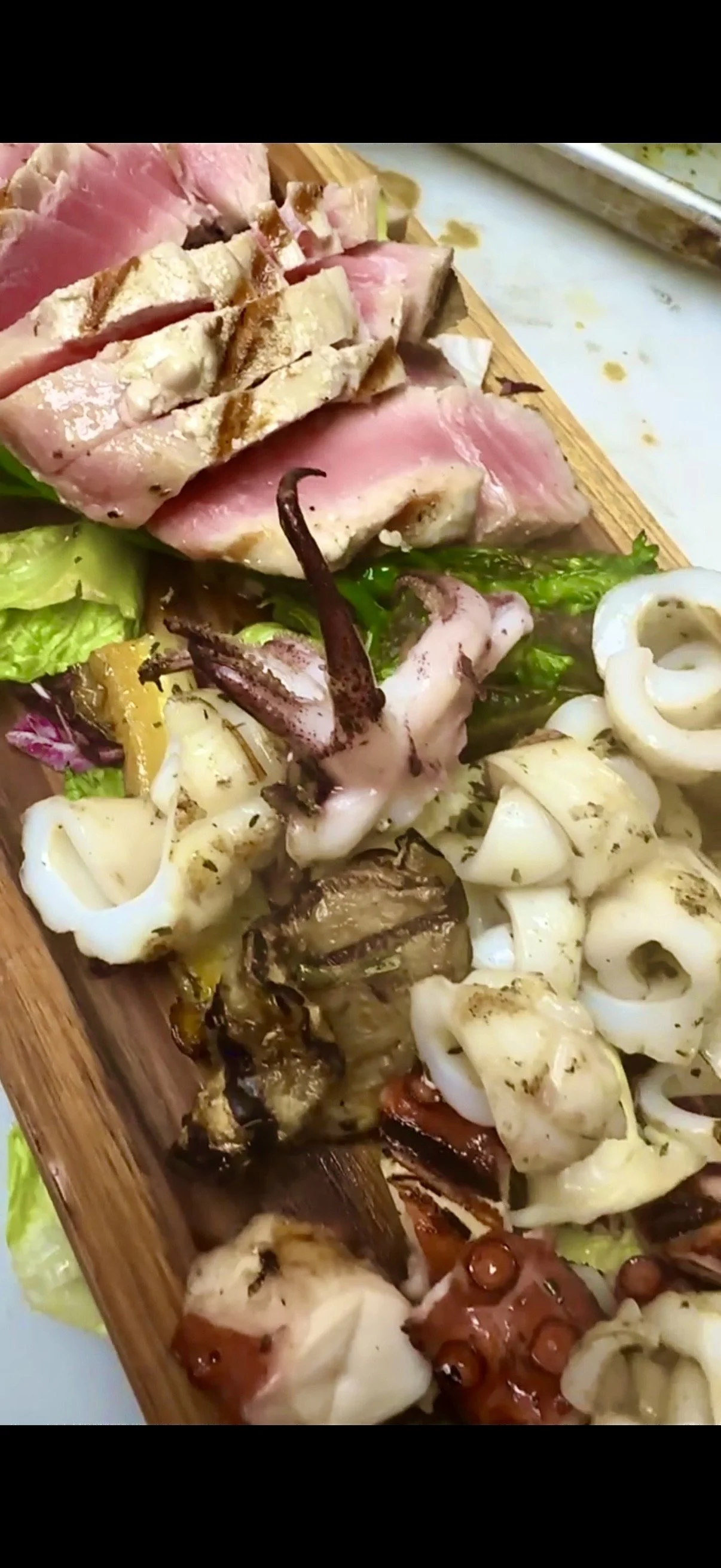 Calamari e Gamberi alla Griglia – Grilled calamari & Argentinian shrimp 🦐 with veg and balsamic.